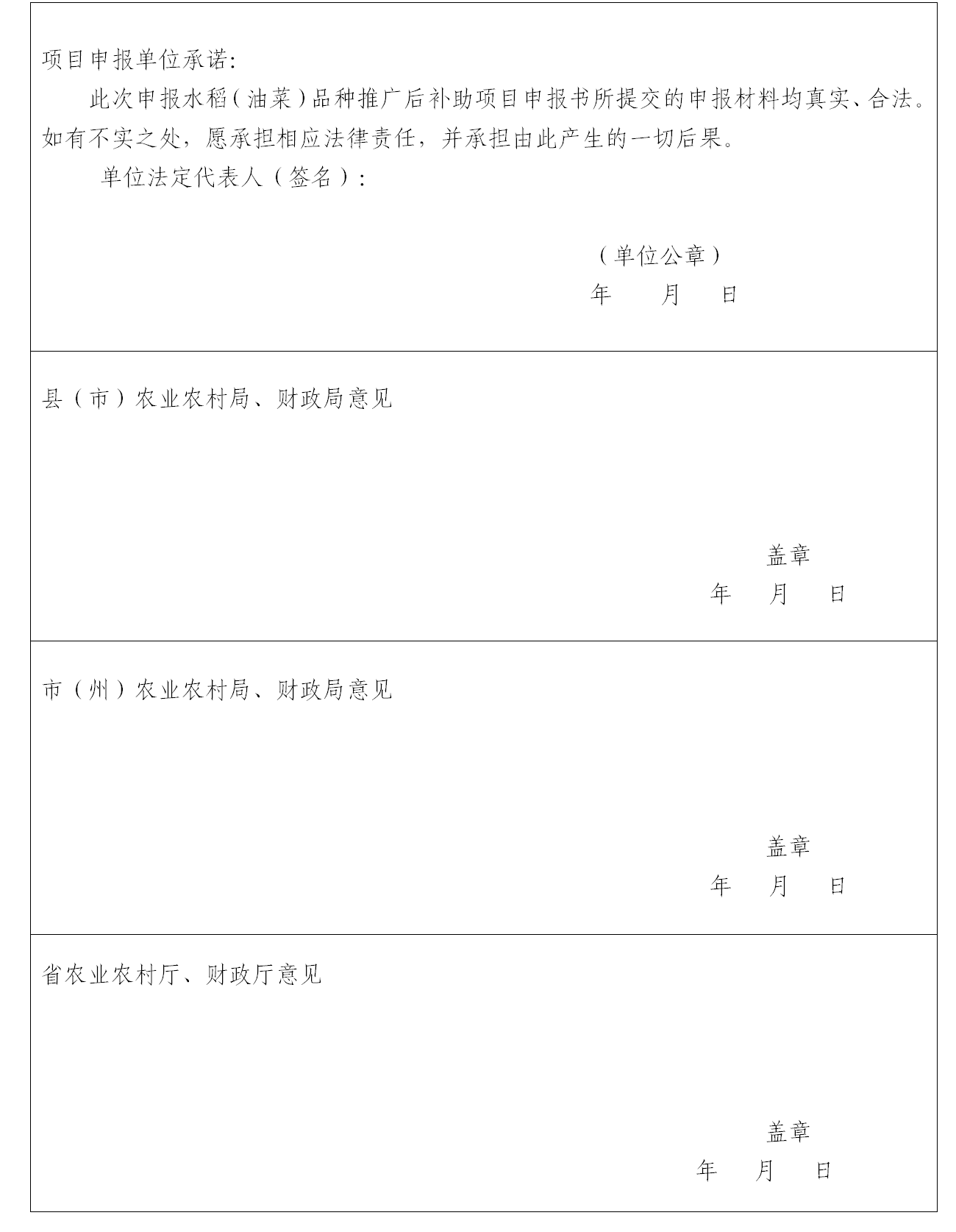(二)申报与审核。企业自愿申报。县级农业农村、财政部门按照项目实施方案要求,要对企业和品种的资质条件进行严格把关,向市州农业农村、财政部门推荐申报品种和企业;市州农业农村、财政部门进行严格审核,向省农业农村厅推荐符合条件的品种和企业。市县对申报材料的真实性、准确性和合规性负责。